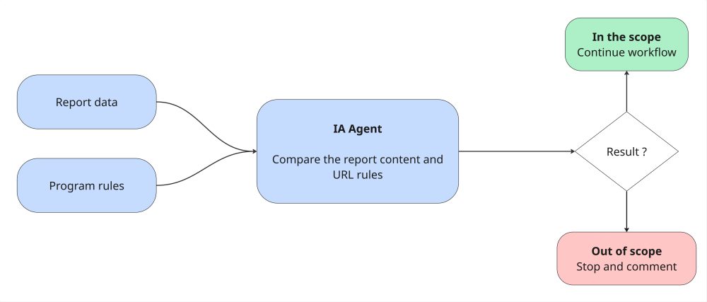 Dans cette première étape, nous cherchons à savoir si le rapport soumis correspond bien au périmètre du programme. Pour cela, nous avons mis en place un premier agent IA qui analyse le contenu du rapport (titre, description et preuve du concept) pour les comparer avec les périmètres autorisé et refusé du programme. Cela permet de définir immédiatement si le rapport est légitime ou si nous pouvons en avertir l’utilisateur directement.user directly.