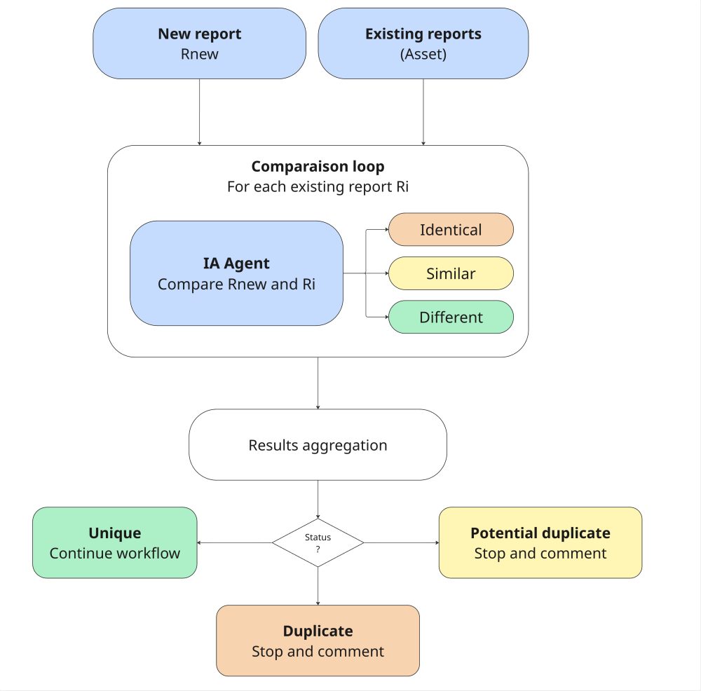 Concrètement, le workflow récupère les rapports existants sur l’asset concerné et l’IA les compare un à un. Si un doublon (ou doublon potentiel) est détecté, le workflow s’arrête et soumet un commentaire détaillé.