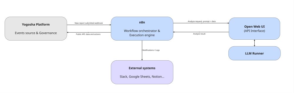 Cette architecture repose sur n8n comme chef d’orchestre. La plateforme Yogosha agit comme source d’événements : lors de la soumission d’un nouveau rapport, elle déclenche un webhook vers n8n qui lance le triage.